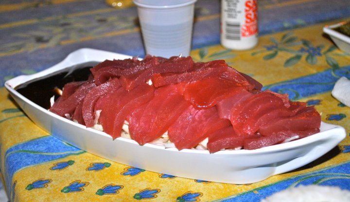 - Un sashimi de thon rouge. Même plus besoin d’aller au restaurant, il y a des plateaux magnifiquement bien présentés en grandes surfaces ou dans les magasins spécialisés.